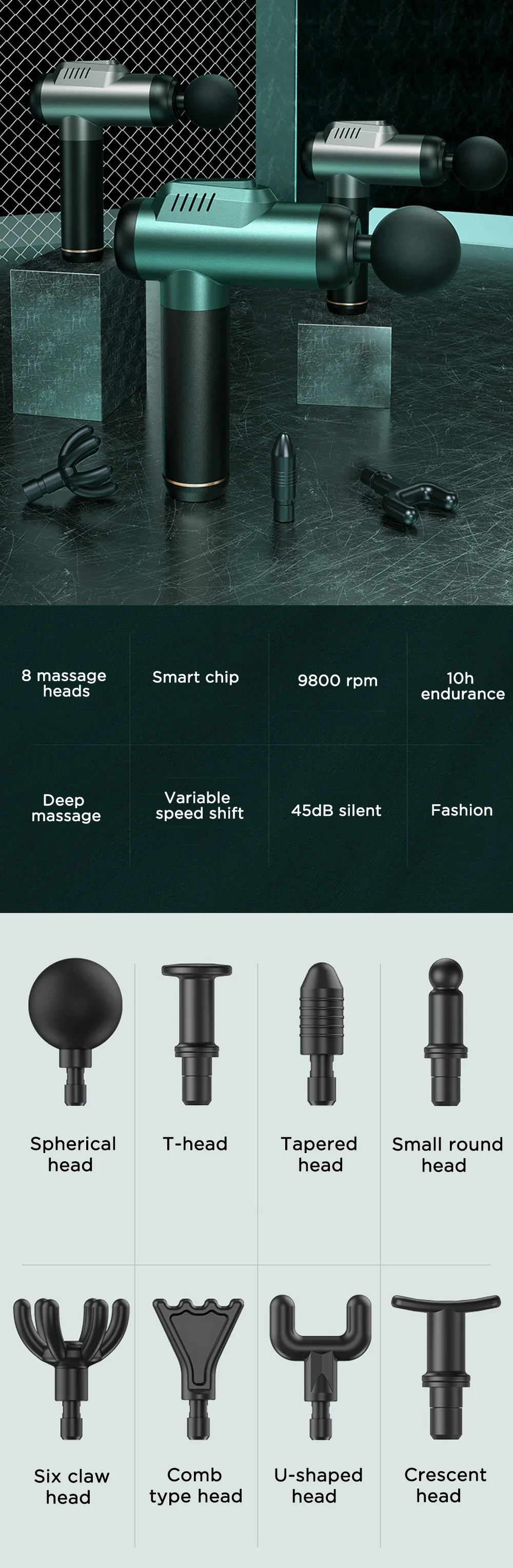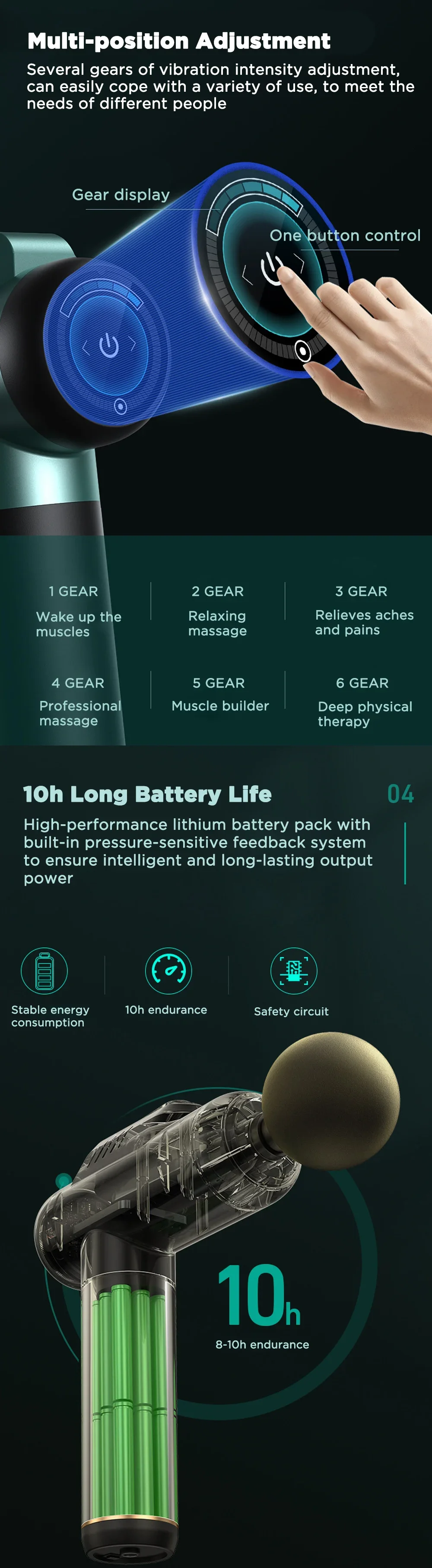 3. Long battery life. The deep tissue massage guns equipped with high-quality rechargeable lithium battery, can be continuously run for up to 10 hours.